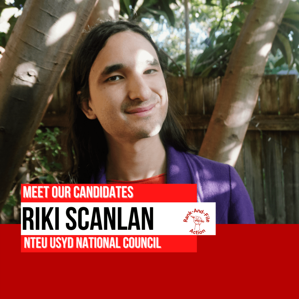 I’m Riki Scanlan. I’m working as a casual tutor in Political Economy, as well as a participant in that eternal purgatory known as ‘completing a PhD.’ I want your support for National Councillor because the NTEU needs a grassroots and left-wing campaign to pressure the Albanese government into taking action.