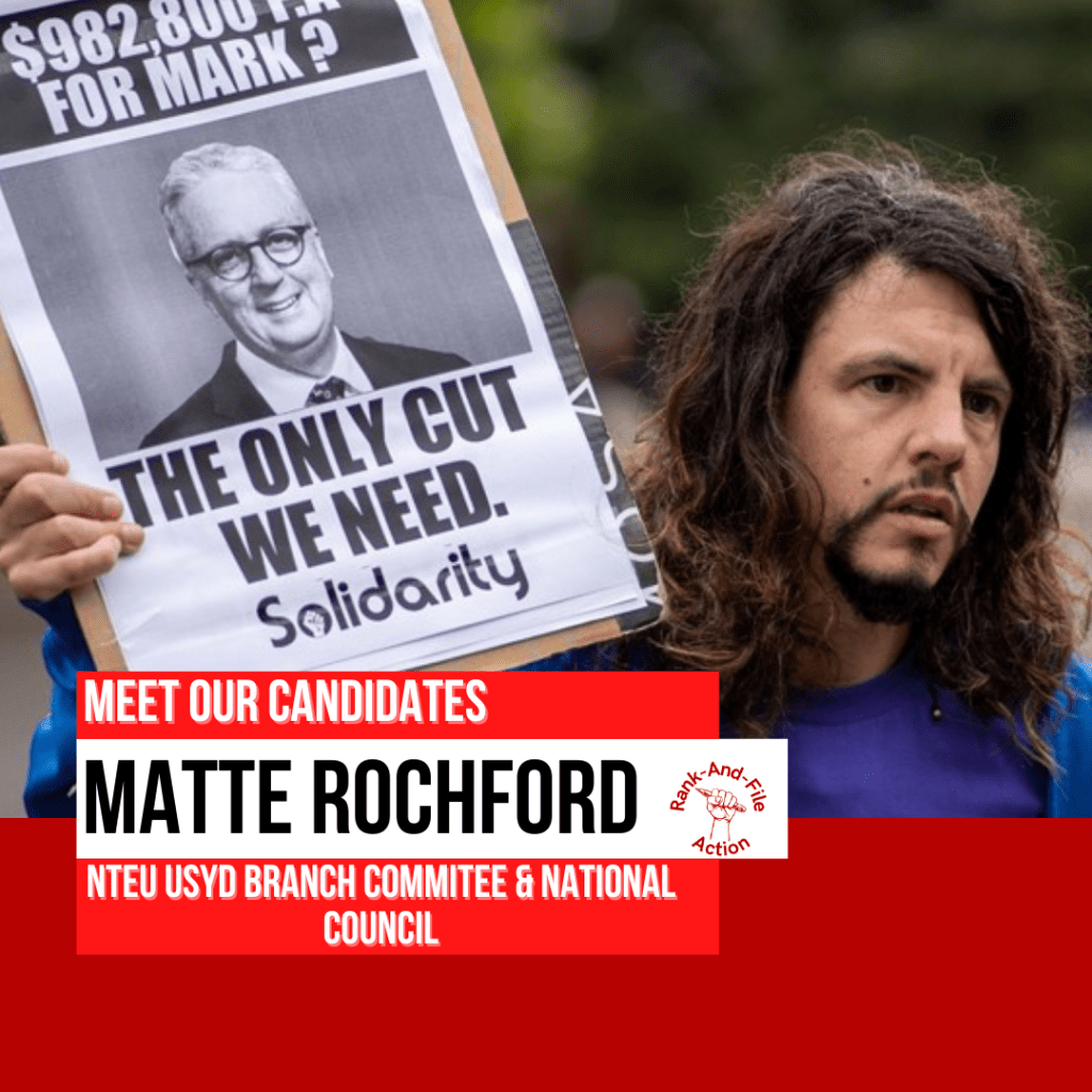Hi. I’m Matte, I’m an artist and union activist with a history of fighting for workers’ rights. I’m not shy about speaking up for my workmates, and with the fantastic strikes at Sydney University set to continue into Semester 2, I see no reason to stop!